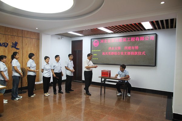 洪水无情,四建有爱。公司发扬“一方有难,八方支援”的中华民族优良传统,9月7日—14日,仅一周时间,全体职工汇聚爱心捐助款项共计111723元,通过集团公司账户捐献给易县人民,用于易县抗洪救灾和灾区人民重建家园。